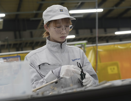 生産部製造2課でヒーターの製作に携わっています。曲げ工程から送り出された製品の端末仕上げになりますね。ネジ締めだったり、リード線を付けたりの作業です。検査前の最終工程なので、常に緊張感を持って業務に取り組んでいます。仕上げ作業は、特に丁寧さが必要なため、最後まで気を抜くことは許されません。集中力を持続させる点を強く意識して、一つひとつの仕事に臨みます。