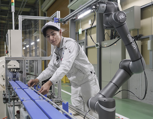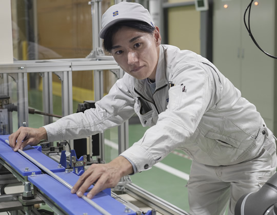 製造課で新規設備の立ち上げを始め、設備のメンテナンス、業務内容の改善を主に行なっています。心がけているのはスピード。新規設備であれば、できるだけ早く仕上げる。迅速さを重視しながら、作業する人の効率が上がるよう生産設備を検討したり、作業改善をしていきます。つくって終わりではなく、むしろ大事なのはつくった後。精査し続ける必要があるからです。機械が壊れたらすぐに修理。原因を探って突き止め、速やかに復旧作業をします。設備の最初から最後まで面倒見る役割ですね。前職での仕事や、入社してから様々な部署で経験してきたことが、有効に活用できている実感があります。