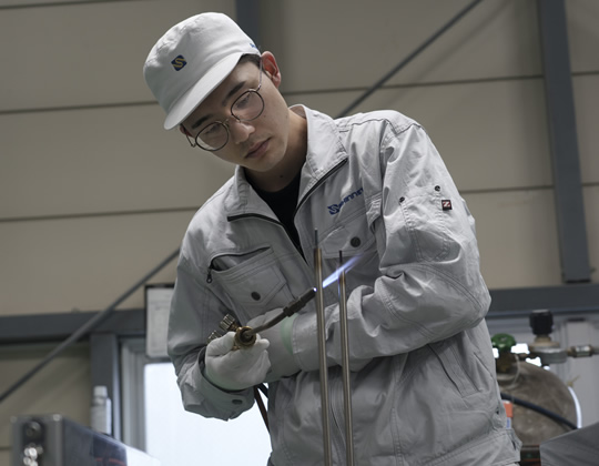 2021年4月に新卒で入社して以来、ずっと生産部製造2課で働いています。当然ですが、一つだけの作業をただ繰り返している訳ではありません。バーナーで炙ったり、その炙った物を仕上げたり、製造にまつわる様々な作業を行なっています。全てオーダーメイド製造ですから製品づくりごとに、やることは多かれ少なかれ異なってくる。そこは自分できちんと計算し、作業の流れをつくっていかないと、スムーズに進行することができません。