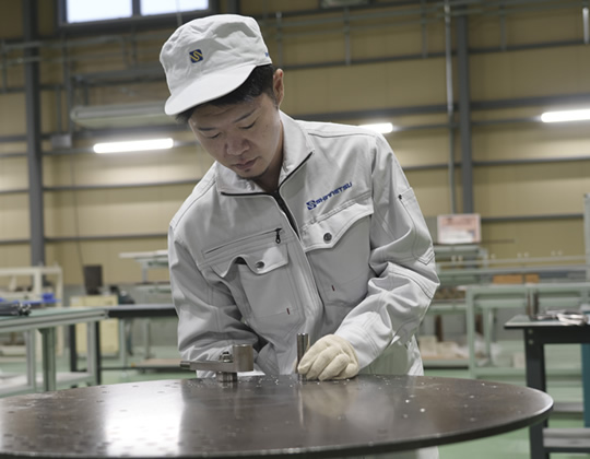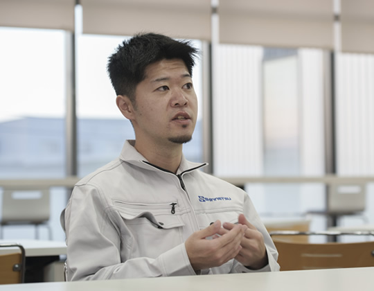 生産部の製造2課に所属し、主任として課内目標に対しての進捗管理を行なっています。順調に進んでいるか、そうでなければどう修正していくか。課員である後輩社員が掲げる個人目標の管理もしています。幅広い意味での管理業務ですね。新しい設備を導入している時期でもありますので、必要な都度、ミーティングもしています。設備導入に関わる外部メーカーさんとの打ち合わせも行なう。管理業務以外では、もちろん自分自身が製造2課のプレイヤーの面もあります。入社当初から曲げ工程を担当する作業に従事してきました。